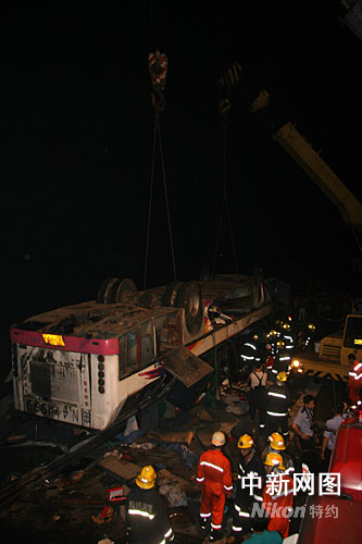 事故現場,救援人員用吊車將已經完全倒翻的大客車托起。