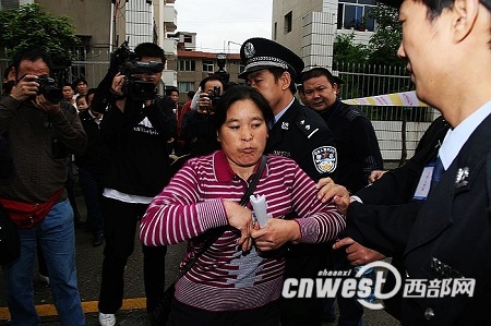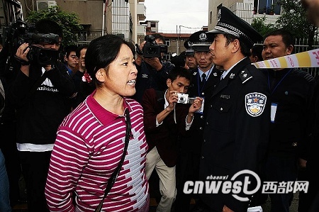 中午10:30 在雨中等待了2個多小時(shí)的羅大翠接到一個電話,在通話的過程中,羅大翠的情緒變得更加激動起來,隨即和執(zhí)勤民警交涉起來,試圖越過警戒線,闖進(jìn)法庭。但是兩次努力都被執(zhí)勤民警婉拒。截至27日上午11時(shí)30分,周正龍案已經(jīng)開庭審理了3個小時(shí),周正龍妻子羅大翠和兒子仍未被允許進(jìn)入法庭。(記者 錢海峰 陳武)