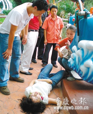 “有人墜地了!”周圍響起叫喊聲。卡在保險杠和座位之間,身子懸在半空的凌澤坤這才發現,李鳳躺在游藝機旁邊的地上。游藝機經過一圈減速后,很快停下來。凌澤坤趕到李鳳身邊,只聽見李鳳說聲“頭痛”就昏過去。動物園管理人員和傷者家屬一起把傷者送到九龍坡區第一人民醫院接受治療。