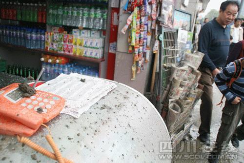 記者在現場看到,人民北路一段25號外,路面全濕,泥漿滿地。離出事現場最近的成都巖礦測試中心臨街的宿舍,1-6樓墻體污漬斑斑。距離被挖爆管道只有兩米距離的成偉干雜店,門口還沒有賣完的報紙上全是泥漿,玻璃櫥窗上污漬斑斑,大小石塊、泥土到處都是。