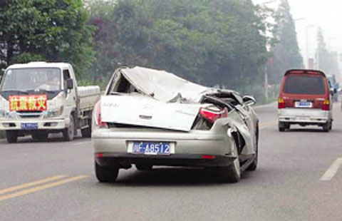 小主人回憶當(dāng)時(shí)的情景,在電話(huà)里笑著說(shuō):“我沒(méi)想到它還能動(dòng),轟油、剎車(chē)都沒(méi)問(wèn)題。”小主人上車(chē)沒(méi)系安全帶,它還一直在報(bào)警提示著主人呢。小主人有8年駕齡,靠著經(jīng)驗(yàn),它慢慢起步了,由于右后輪完全變形,小跑起來(lái)有點(diǎn)跛,但跑起來(lái)后還比較穩(wěn)定。小主人將音響打開(kāi),它還能唱歌。就這樣,15公里的路程,從漢旺到綿竹修理廠,頑強(qiáng)的它引來(lái)無(wú)數(shù)人的眼光。它哼著歌,以30-40公里的時(shí)速,搖搖晃晃地到達(dá)了目的地。