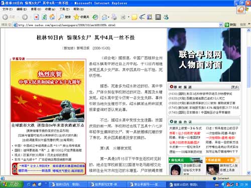 同時,在國內(nèi)多家網(wǎng)站社區(qū)和論壇內(nèi)也出現(xiàn)一則標(biāo)題為《桂林全州10天驚現(xiàn)五具少女裸尸》的網(wǎng)絡(luò)貼子。一時間,這條消息在網(wǎng)絡(luò)瘋傳開來。