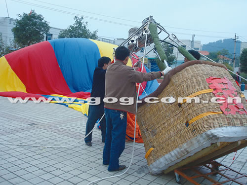 昨日上午,貴陽和尚坡水電九局廣場里一片喜慶。記者在現(xiàn)場看到,由紅黃藍三色組成的熱氣球停在地面上,現(xiàn)場聚集了上百人圍觀。上午7點,經(jīng)過嚴格培訓后具備駕駛熱氣球技能的工作人員來到廣場上,他們分別對熱氣球進行升空前的檢查工作:一組負責檢查熱氣球的整體情況;一組負責查看新郎、新娘乘坐的熱氣球竹籃;一組負責檢查、調試加熱設備!7點40分,方江濤和劉小南乘坐婚禮花車抵達廣場。由于風力較大,熱氣球必須將氣囊鼓足。就在這時,鼓風機很不識趣的“罷工”了,不論工作人員怎么努力調試,鼓風機還是一動不動?吹竭@樣的情形,方江濤只好從花車上跳下來,挽起衣袖檢查機器。20分鐘過去了,鼓風機終于“砰砰砰”發(fā)出聲響。在一旁圍觀的群眾打趣說道:“看來這個即將升空的‘神舟八號’只有新郎才能搞定呀!”