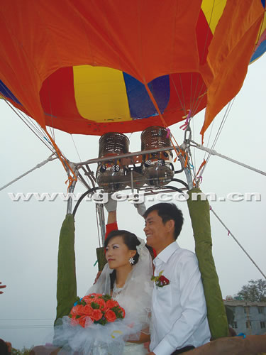 8點20分,新郎方江濤和新娘劉小南坐進1米高的竹籃里,乘坐被4根繩子拽著的色彩鮮艷的熱氣球慢慢升空了。1米、2米……熱氣球在掌聲中一點點離開地面,新人的臉上也充滿了喜悅和興奮,新娘向地面不住地舞動著手臂,新郎也不時地替新娘整理被風吹起的秀發(fā)。大約10分鐘,熱氣球升高到50米左右后,漸漸下落回到地面。