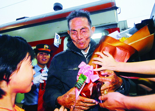 人們爭先涌向老人,想親眼目睹英雄的容貌,一時(shí)間把他圍了起來。老人在火車站廣場上走了大約200米,用了將近10分鐘。他的眼眶再次泛紅,卻又咧開嘴露出孩子般的笑容。
