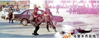 高速公路上,一輛黑色轎車突然沖過交警卡點,警笛響起,頭戴鋼盔、手持微型沖鋒槍的特勤民警快速出擊,嫌疑人向民警開槍時被“擊斃”……10月21日,新疆高等級公路交警支隊進行了建隊十年來,規模最大的一次快速應對高速路突發事件演習。