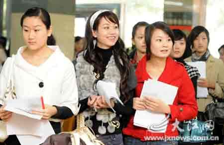 在南昌航空大學就讀的一位大四學生告訴記者,此次連自己共有6人來面試,但目前只有兩人進入復試,其余4人就是卡在英語關和反應能力的考驗上。記者在現場看到,進入面試的應聘美女在填寫個人簡歷時也必須用英文。