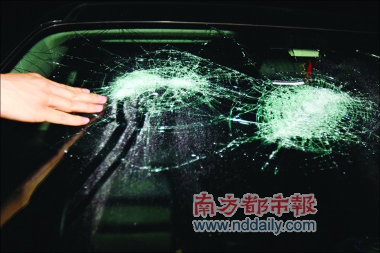 事發梅林一村84棟北側停車場。記者昨天下午6時左右趕到現場看到,被砸爛的是一輛黑色馬自達6轎車,該車的前擋風玻璃有兩處拳頭大小的被砸痕跡,右前車窗整塊玻璃中間有一個被鈍器擊打造成的大口子。