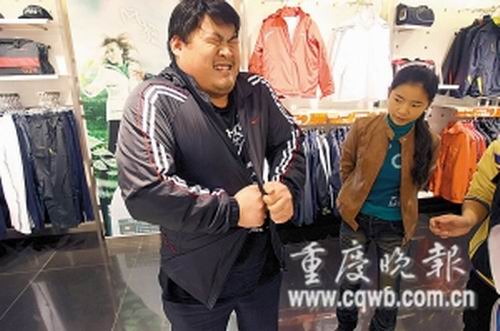 普通衣服不行,寬大的運動服或許可以!在記者建議下,王杰來到南坪步行街的某運動專賣店,店長拿出該店最大的4XL特大裝,王杰連袖管都不能自主穿進去,后在眾人協(xié)助下勉強穿上身,卻像成年人穿童裝,明顯不合身。