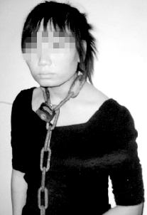 不一會兒,孫曉健帶來一個女孩,只見女孩的脖子上套著一根鐵鏈子,她雙手抱著鐵鏈,渾身發抖,兩眼含淚,一言不發。