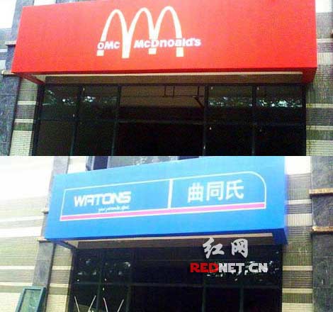 “這擦邊球打得很牛很雷人,真是山寨店鋪大薈萃啊!”8日晚上,網(wǎng)友“鍋爐工”在紅網(wǎng)論壇發(fā)帖爆料,稱在網(wǎng)上看到一個(gè)題為《對(duì)不起,我真的被雷到了,南京最雷人山寨店群》的圖片帖,圖片顯示在南京文安街上,林立的店鋪清一色是山寨名牌店鋪,其中屈臣氏、必勝客、麥當(dāng)勞、李寧、星巴克、哈根達(dá)斯等分別被克隆成曲同氏、必勝糊、李明、巴克星、哈根波斯等。