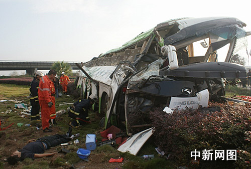 中新網溫州11月12日電(記者 江耘 通訊員 鄭國前)11月12日上午7時30分,浙江溫州發生一交通事故,一輛湖南牌照的旅游大客車,行駛至金麗溫高速公路溫州段,在南白象出口匝道出,撞壞了50多米護欄后,從6米多高的橋面翻落到地面上,翻了個身后,立在了高架橋下的綠化帶里。事故共造成2人死亡,17人受傷。