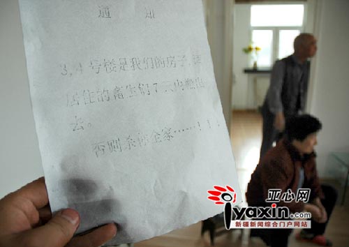 造成這一現(xiàn)象的原因是由于十天前,此小區(qū)里突然張貼了十幾張通知,內(nèi)容很恐怖:如果三、四號樓的住戶不搬家,就殺他全家!!!昨日此新聞在亞心網(wǎng)上發(fā)布之后,立即被全國各大網(wǎng)站轉(zhuǎn)載,影響力非常之大,網(wǎng)民的反應(yīng)也相當(dāng)強(qiáng)烈。基于強(qiáng)大的社會輿論壓力,前期一直不肯露面的星云房產(chǎn)公司接受了亞心網(wǎng)記者的采訪。