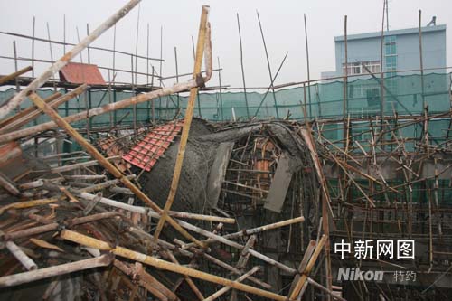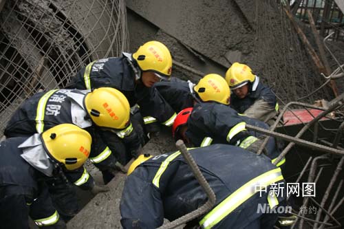 據了解,鄞州消防大隊接到報警,迅速出動3輛消防車18名消防戰士到達現場,發現六七名施工人員已經倒在鋼筋水泥中,但幸好不是埋的很深,于是消防戰士就用救援器械將困住受傷者的斷裂鐵架等雜物一一清理掉。