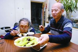 “別急,還有菜”,宋金萍沖老師耳朵提高聲調,并端起菜碗往老師碗里添菜。