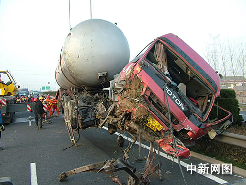 中新網淮安十二月九日電(朱曉穎 閻大偉)七日清晨五時三十分許,京滬高速江蘇淮安楚州段一輛載有一千六百四十箱、萬余把斧頭的大貨車與一輛裝有二十多噸液化氣的槽罐車相撞,由于巨大撞擊力,兩車均沖出護欄、側翻在路邊的溝中,所幸未造成人員傷亡。