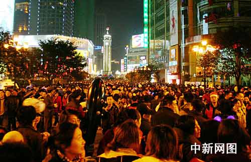 晚上7時許,到解放碑的人群已經人潮涌動,并不斷有頭戴圣誕帽或彩條假發、手持充氣棒或熒光棒的狂歡人群涌入。