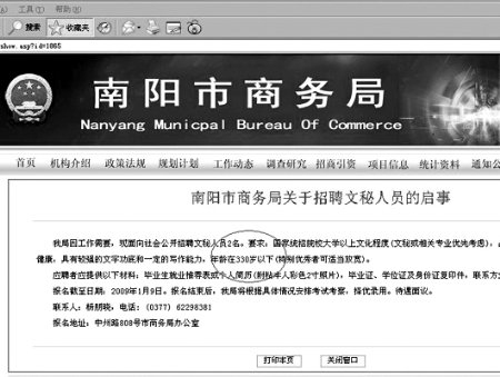這不,南陽(yáng)市商務(wù)局網(wǎng)站就有消息稱:商務(wù)局招聘兩名文秘,要求年齡不能超過(guò)330歲。