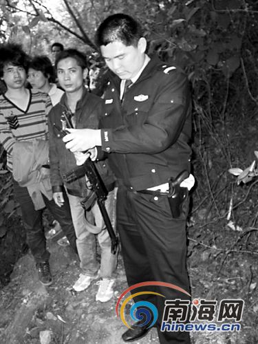 14點20分,為確認山坡上的水牛是否被擊斃,一名民警前往山坡查看,為保證安全,這名民警挎上了一支沖鋒槍。