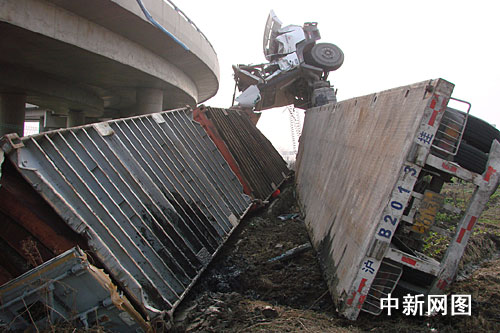 中新網(wǎng)湖州1月23日電(記者袁爽 通訊員汪焱)近日,一輛重型集裝箱半掛車(chē)在途經(jīng)申蘇浙皖高速公路皖向織里下主線匝道處時(shí),不僅超速行駛,更是嚴(yán)重超載超限,結(jié)果該車(chē)在高速路上玩起了“變形金剛”,釀成慘劇。據(jù)了解,出事車(chē)輛碰撞右側(cè)護(hù)欄后翻下落差7米的橋梁。記者俯瞰現(xiàn)場(chǎng),該車(chē)就像是美國(guó)大片《變形金剛》里躺下的擎天柱,所幸車(chē)上人員受傷較輕,無(wú)生命危險(xiǎn)。