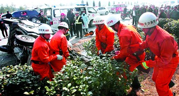 10多分鐘后,接警的消防戰(zhàn)士、解放軍163醫(yī)院的醫(yī)務(wù)人員、望城縣交警大隊(duì)的交警趕到了事故現(xiàn)場(chǎng)。消防戰(zhàn)士迅速用工具切割車體,將車內(nèi)傷員救出,醫(yī)務(wù)人員將傷員迅速送往醫(yī)院。由于節(jié)后返程的車輛大增,交通一度堵塞。交警迅速疏導(dǎo)交通,3名當(dāng)?shù)氐闹伟碴?duì)員也馬上投入到搶救傷員之中,一臺(tái)從岳陽(yáng)返回廣東的吉普車路過(guò),見(jiàn)此情景,一名警察也跳下車來(lái)幫助疏導(dǎo)交通,當(dāng)?shù)夭簧俅迕衽浜辖痪谑鹿尸F(xiàn)場(chǎng)設(shè)置警戒線……車禍現(xiàn)場(chǎng)雖然慘烈,但軍警民生死大營(yíng)救有條不紊地進(jìn)行。