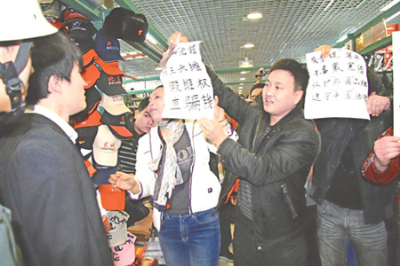 2月8日上午9點半,北京秀水街市場有限公司依據(jù)北京英特普羅知識產(chǎn)權(quán)代理有限公司向其提供的一份公證書,以涉嫌售假為名,準(zhǔn)備對市場內(nèi)的7家商戶進(jìn)行封攤處罰。但在場商戶卻手持公證處的一份“證明”,強烈質(zhì)疑英特普羅代理公司出具的售假公證存在“證據(jù)不足”,并與市場管理人員和保安發(fā)生沖突。