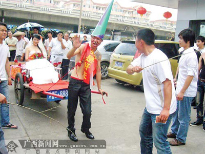 兩位新人的老鄉趙先生參與策劃了這次接親活動。“這樣惡搞其實就是圖個熱鬧!”趙先生告訴記者,在老家邵陽,每家人迎親時都要大鬧一番,形式不限,花樣翻新,越熱鬧越好,“有句話叫‘結婚三日無大小’,說的便是結婚那幾天不必計較輩分,誰都可以拿來惡搞。因此,新郎的父親也被拉進迎親隊伍,甚至遭到‘鞭打’。而新郎在迎親當天一定要吃夠苦頭,有車不能坐,要拉著新娘走,被鞭打更是家常便飯”。