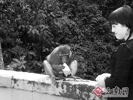 當(dāng)時,兩只猴子正一前一后站在公路旁的擋墻上,一邊來回走動啃食游客“進(jìn)貢”的食品,一邊不斷發(fā)出“唬!钡暮鸾新暎路鹗窃趯^的游人說:“快進(jìn)貢些好吃的來,不然休想打此經(jīng)過!倍慌砸延袛(shù)輛路經(jīng)此地的車?吭诼愤叄10余名游客正興致勃勃地圍著兩只猴子觀看,幾名膽大的游客正在接受猴子的命令,乖乖地向猴子奉上隨車攜帶的食品,以供他們享用。