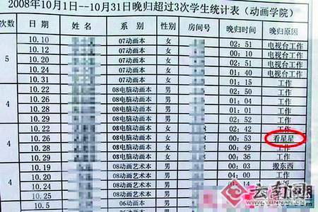 近日,北影校園內張榜公布了各系晚歸宿舍的學生名單,有意思的是,學校竟然還把超過3次晚歸的詳細原因都公布了出來。昨天,有好事網友將這些名單傳到了網上。據記者觀察,學生們晚歸的理由五花八門,有“電視臺工作”、“吃飯”,也有“拍戲”、“回家”,而動畫學院一位女生的理由竟然是“看星星”!巴須w表格”一時間被無數網站轉載,點擊率一路攀升,而廣大網友的評論似乎也并不客氣。因為北影是藝術院校,加上娛樂圈給人的感覺是魚龍混雜,很多人的矛頭直指藝術院校學生的素質。