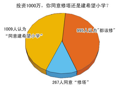 截至昨天下午5時,大渝網發起的調查顯示,你認為修建第一高塔有必要嗎?2475人參與投票,1154位網友認為“沒必要,又是面子工程”;1091人認為“為了導航,也能增添新景觀”。在“投資1000萬,你同意修塔還是建希望小學?”的調查中,網上2271人參與投票,1009人認為“同意建希望小學”;267人同意“修塔”。