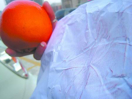 “網(wǎng)友們說,有些商販為了讓橙子色澤更漂亮、賣相更好,就把色素注射到橙子皮里,再在皮上打些石蠟,使橙子看起來很新鮮,但這樣的橙子會(huì)‘掉色’。”許女士說,她用紙蘸了些水,在還沒食用的橙子上擦拭,“紙變成紅的了,我又用手去擠剝下來的橙子皮,流出來的水也是紅的。”