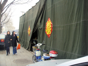 記者11時趕到分鐘寺東南角,看到在三環(huán)輔路行人道上,一個大棚支在一排修車店前。幾根金屬架子,幾塊大的深綠色厚被子搭成了這個棚子(左圖)。棚子的門口兩個大紅喜字貼在布上,棚內(nèi)左側(cè)已經(jīng)支起五個折疊桌,有兩位賓客已經(jīng)落座,右側(cè)一個大鍋正燒著旺火,并排的兩個桌子上放著雞和蔬菜,三五個人正在切肉切菜準(zhǔn)備一會兒做飯用。