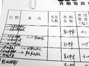 在一份招待用煙流水賬中,從2008年11月至2009年2月期間,招待用煙共用去了5277包,近530條。每個月的招待用煙數量都超過了1319包,均為中華香煙,有硬盒有軟包,按均價每盒50元算,相當于每月要花銷6.6萬元。記者發現,其中用煙數量最多的是今年的1月份,共用去2789包中華牌香煙,約為280條。在這份招待用煙的流水賬最下方,則標出了這四個月當中招待用煙數目出現了超支,多用了1934包。