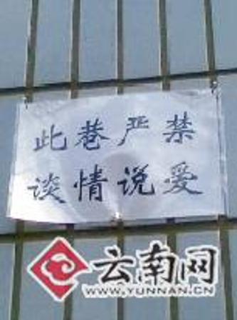 “此巷嚴禁談情說愛”,繼南京現“最牛公開信” 勸大學生情侶莫開房后,昨日,昆明學院昆師路校區內的一條小巷里也出現了一張類似告示。