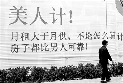 根據(jù)何先生所提供的線索,記者在河醫(yī)立交橋向西約1000米的棉紡東路上,看到了這則面朝南的巨幅房產(chǎn)廣告。白色布景的廣告墻上赫然寫著那句讓何先生不爽的廣告。該廣告美其名曰“美人計”,是為“粉領(lǐng)公寓”做的廣告,從廣告語來看,其目標(biāo)消費群是女性。