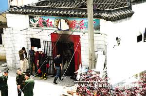 由于棋牌室所在的巷子已經被大量圍觀群眾堵住,記者在附近居民的協助下來到在棋牌室東側的警戒線附近,記者清楚地看到,棋牌室的廣告牌已經被火燒得變形,鐵門也面目全非,門口橫七豎八堆放著大量被火燒過的桌椅。