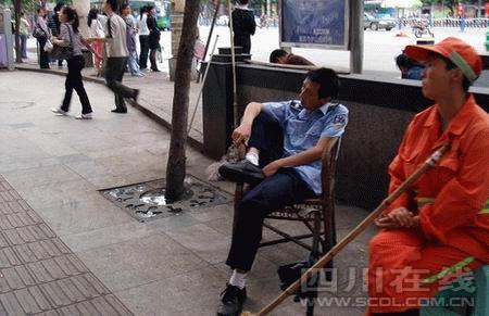 昨日,照片里的主角,宜賓市翠屏區市容管理局南城中隊協管員李劍勇表示,單位領導已批評教育他了,自己影響了宜賓和宜賓城管的形象,他表示非常抱歉。“當時所有的攤點都已規范位置了,想坐著休息下。”李劍勇說,城管協管員沒有固定工作點,他便在游攤最易出現的南門橋頭坐著休息會兒,他希望所有的城管隊員都將他作為反面教材,在以后的工作中注意紀律和形象。