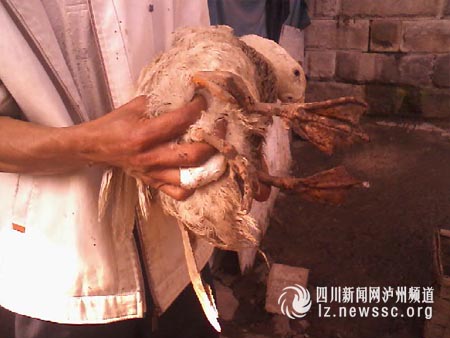 王智昇,家住納溪永寧河邊,是納溪第一個吃低保的特困戶,平常以養鴨子為生,因他家中出現一只與鴨不同的鴨,該鴨全身白色,初見時不細看,未發現有何不同之處,經過仔細觀察后發現,該鴨確實與眾鴨不同,原來這只鴨子有四只腳,兩腳在地上行走,另外兩只腳隱藏在靠近尾部的背上,時隱時現,待主人將鴨子抱起,弄開尾部羽毛,才露出廬山真面目,隱藏的兩只腳清晰可見,形狀與行走的兩只腳沒有什么差異。區別僅僅是由于隱藏的兩只腳未進行功能鍛煉,行走只是顯得略微小心。