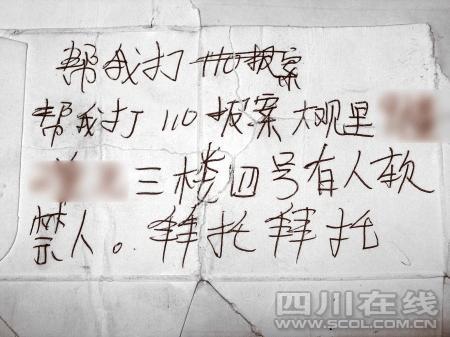 “幫我打110報案……有人軟禁人,拜托拜托!弊蛉障挛2點,家住成都大觀里某小區的一位大爺正在小區內散步,突然,一張硬紙條歪歪扭扭地從三樓窗戶飄落下來,大爺拾起一看,大吃一驚,立即將紙條交給小區門衛。5名警察接警后立即出動……
