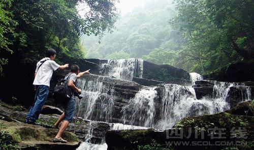 沿著玉屏山頂?shù)穆糜斡^光道前行不久,右側(cè)樹林邊出現(xiàn)了一個(gè)醒目的標(biāo)識(shí)牌:玉水谷。牌子邊,一條滿是青苔的石板路彎彎曲曲地往山谷深處延伸;步行15分鐘,一條清澈的小溪即映入眼簾,其間綿延的疊瀑群格外迷人,這便是昔日的“磨子溝天體浴場”,現(xiàn)在的“玉水谷”。