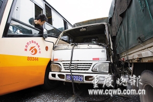 昨下午1點半,記者在事發地雙碑石井坡車站紅綠燈處看到,一輛長安小貨車卡在805路公交車和另一輛貨車之間。長安小貨車車體嚴重變形,擋風玻璃全部被撞爛,碎玻璃撒了一地。公交車和另一輛貨車,車身上都有重重的擦損痕跡。