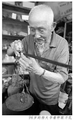 “大爺,幫我稱點白糖……”一名顧客喊道。只見老人從一大袋白糖中用勺子舀了一小袋,放在柜臺上的秤盤上,輕推秤砣。“一斤二兩!”老人喊道,“二元五一斤,一斤二兩三元!”這,恐怕只是96歲的楊大爺日常生活中的一個普通瞬間吧,記者尋思。“大爺,幫我拿包藍嬌嘛……”為了進一步驗證人們的說法,記者說道。“12元!”楊大爺從十幾個品牌的香煙中,準確地拿了一包藍嬌放在柜臺上。“找你88元!”見記者拿了一張百元紙幣,楊大爺隨即回話。楊大爺把百元大鈔放到陽光下,細細查看水印,并不斷用手摸著紙幣的防偽標志。確認為真幣后,楊大爺迅速地給記者找了零錢。