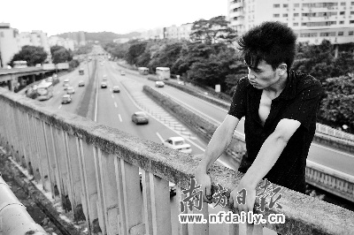 記者趕到現場時,這個穿著黑襯衣、牛仔褲的20多歲的小伙子正站在市二醫院對面、皇木崗立交橋最高處的護欄外,與民警對峙。兩輛警車分別停在距離該男子七八米遠的兩側,幾名民警站在一邊。立交橋下的馬路上,幾名民警已經拉開氣墊。
