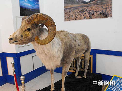 阿克塞哈薩克族自治縣縣委宣傳部熱提劍今日向記者介紹,該縣展覽館陳列的盤(pán)羊標(biāo)本是國(guó)家二級(jí)保護(hù)動(dòng)物,屬牛科中體型最大的一種,棲息于海拔2000——5000的沙漠和山地交界的沖擊平原和山地低溝中。雄性角粗大,由頭頂向下并向后螺旋狀彎曲,幾乎可達(dá)360度,主要分布在阿克塞哈薩克族自治縣境內(nèi)于大、小哈爾騰前山和安南壩地區(qū)。