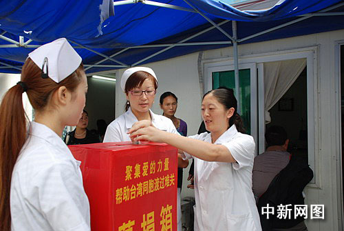 中新網汶川8月19日電(鐘美蘭 李萍)“我們受災了,全國都在幫我們,我家現在用的被子,牙刷都還是去年的救災物資,現在知道臺灣遭遇風災,我也要盡自己的心意。”8月19日,汶川縣醫院募捐現場,在一群身穿白色衣服的醫生護士人群中,一位身穿黃色衣服的人異常顯眼,他仔細將手中的10元錢鋪平,莊重地放進紅色的箱子。