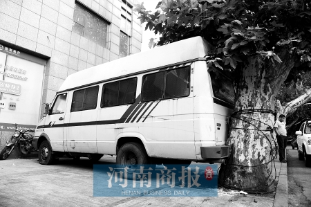 在鄭州市經(jīng)六路與緯三路交叉口附近,這輛白色依維柯車牌號(hào)為豫A69026,車頭朝東,距臨街建筑的墻壁大約有一米,車頭與墻之間被人“塞進(jìn)”了一輛三輪車。車尾朝西,緊緊貼住人行道邊的一棵樹(shù)。車身擺得很正,剛好把人行道堵死。