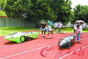 歷經(jīng)暑假兩個多月打造,外形如一顆黑色子彈、25毫升汽油可跑8000米的概念車“子彈頭”驚艷亮相,近日在華農(nóng)大操場進(jìn)行了性能測試。這輛車的制作團(tuán)隊主要由30多名大三大四學(xué)生組成,從制作配件到設(shè)計安裝全部手工完成。該車全長3.2米,高70厘米,重約20公斤,由一人駕駛,時速可達(dá)40~50公里,本月下旬將赴上海參加一項節(jié)能車競技大賽。
