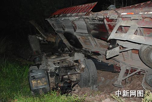 4時15分,消防隊員趕到事發(fā)路段,只見大掛車正翻倒在路旁,由于側(cè)翻時車體與地面產(chǎn)生摩擦非常大,掛車車頭嚴(yán)重變形,滿載的鋼筋及車體碎片散落一地,事故現(xiàn)場能清晰的看到一條磨擦印。此時,副駕座上的一男子整個身體都已被甩出駕駛室外,但是該男子頭部卻被卡在右側(cè)車窗處,經(jīng)現(xiàn)場救護(hù)醫(yī)生判斷該名人員已沒有了生命體征,已經(jīng)死亡。