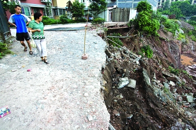 昨日,沙坪壩區石小路64號附1號,小區后方的邊坡及圍墻已經坍塌,居民小心地從旁邊走過 記者 梁杰 攝