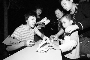 9月30日,海淀區華清園,大學生社工吳揚在社區迎中秋活動中向居民發放燈謎。本報記者 秦斌 攝